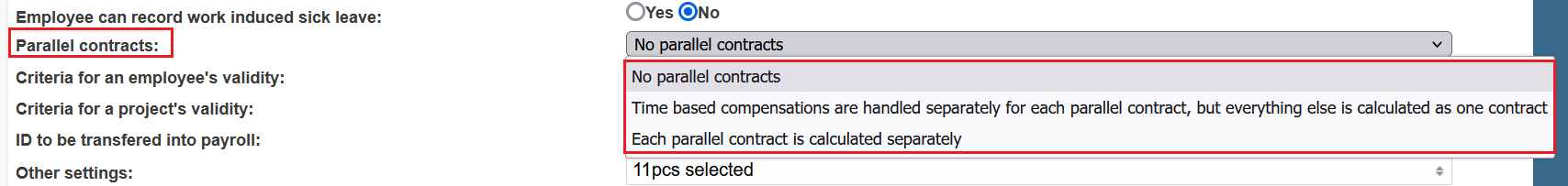 When parallel sets of contracts are in use at the company, a parallel set of contracts can be used for the employee's work contract and projects. This happens so that each contract series is named (for example, in a certain industry) according to the project (Contract series):
