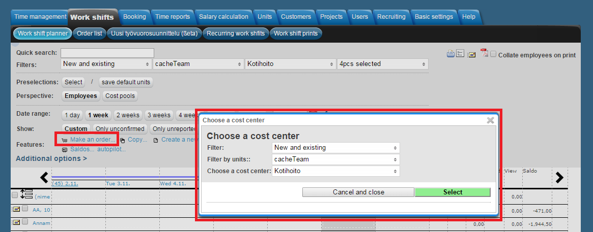 A new Work shift auction can be created by clicking the "Make an order"-button in the Work shift planner's features.