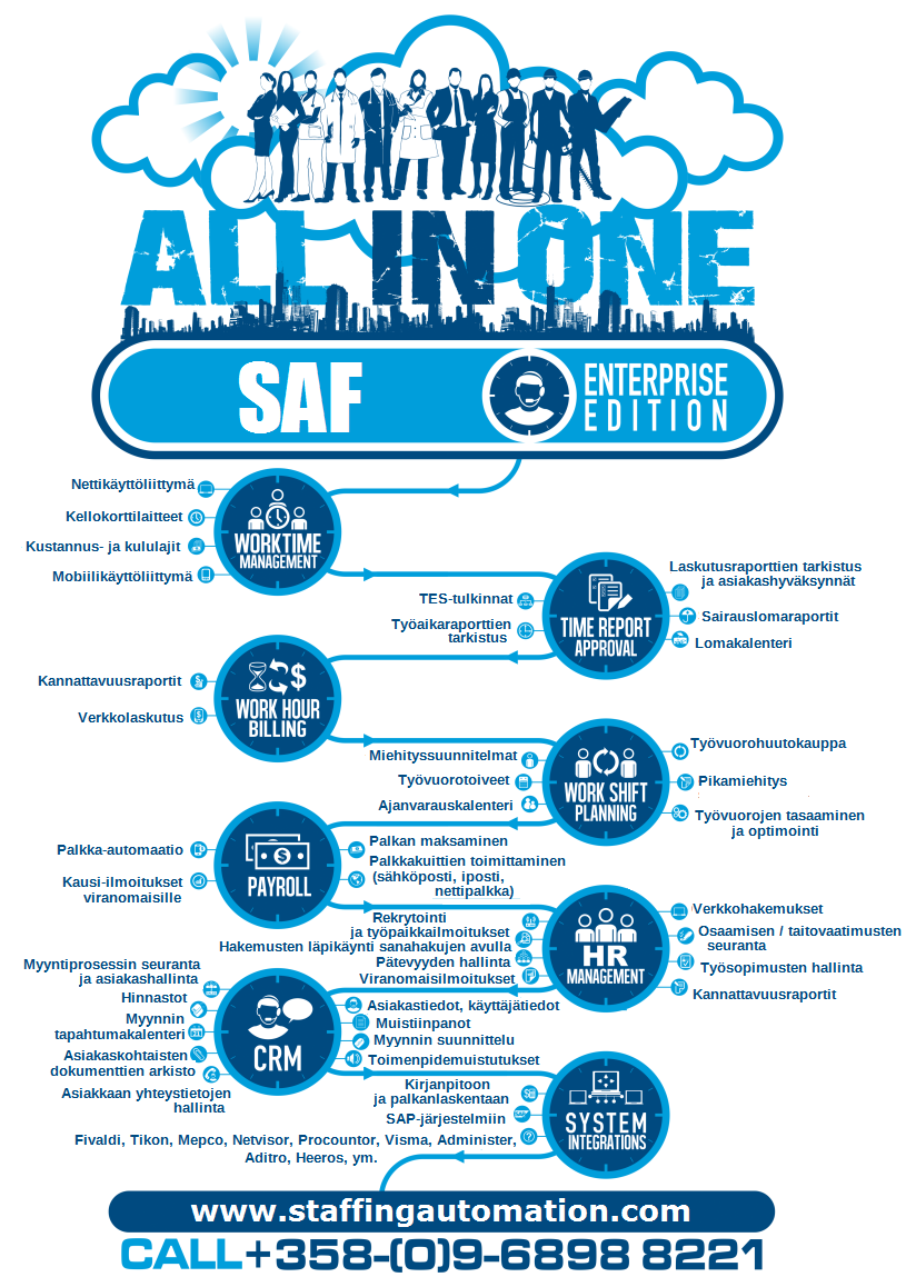 - Sisältää myös työvuorosuunnitteluun, rekrytointiin, henkilöstöhallintaan (HRIS), asiakkuuksien hallintaan (CRM) sekä liikkuvan työn toiminnanohjaukseen (ERP) liittyviä toimintoja.